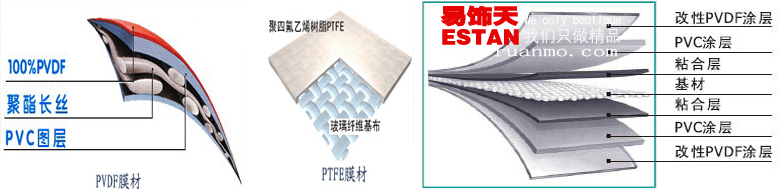 ETFE(EthyleneTetraFluoEthylene)沒有布基,是一種顆粒狀結晶體的薄膜。一般做成雙層或三層充氣結構,厚度12~500um;透光率在95%以上;強度一般在30~60N/mm2之間;耐火等級B1級。