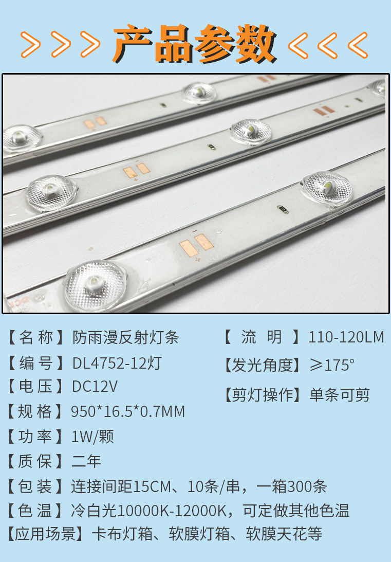漫反射燈條是易飾天LED在常規(guī)LED貼片卷簾燈的基礎(chǔ)上制作的亮度更高、發(fā)光角度更大的新型背光源產(chǎn)品;易飾天LED的漫反射燈條一般均采用高導熱航空鋁基板,以大功率3030燈珠做為光源,加置專用PMMA光學透鏡制作而成;其主要優(yōu)點是超高亮度配合170度的廣角發(fā)光,在單位面積里以更少的燈珠/燈條數(shù)量獲得最優(yōu)的光通量和光源分布優(yōu)化。詳細要求請與技術(shù)人員聯(lián)系